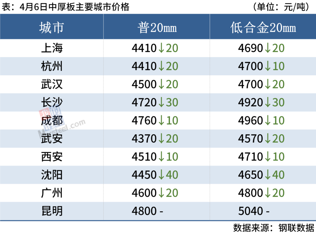 中厚板:4月6日,全国24个主要城市20mm普板均价4540元/吨,较上个交易日下跌19元/吨。6日期货价格继续下挫,近期全国各地迎来降雨天气,工地需求有所下降,市场中板库存增加明显,市场投机较为谨慎,成交一般,市场信心再次受挫。短期市场需求的释放速度较为缓慢,后期市场看法不一。综合来看,预计7日全国中厚板价格持稳运行。