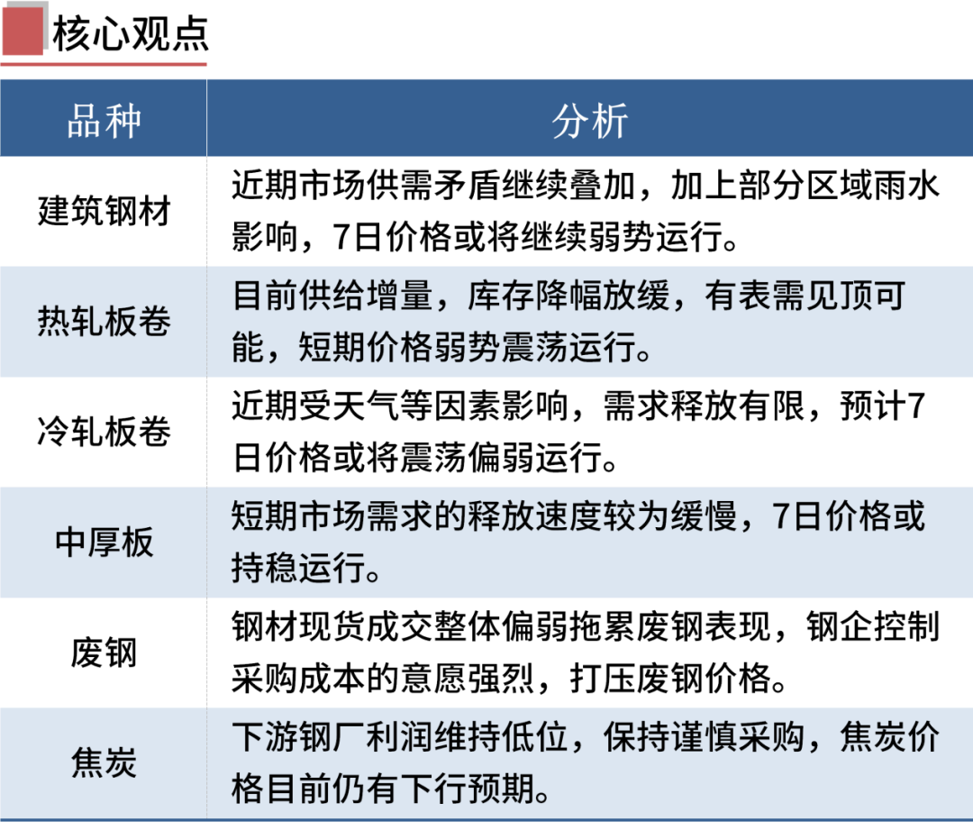 综合来看,近期钢铁产量仍处于高位运行,需求表现一般,库存去化缓慢,供需矛盾显现。由于钢厂亏损幅度扩大,对原燃料价格打压意愿较强。短期钢市供需基本面偏差,钢价呈现震荡偏弱运行。