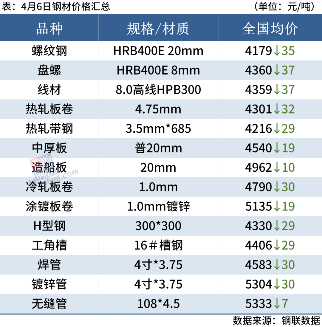 4月6日,国内钢材市场弱势下跌,唐山迁安普方坯出厂含税稳报3800元/吨。早盘期螺低开低走,钢材现货价格延续弱势。现货成交整体偏弱,市场情绪偏悲观,交投氛围冷清,投机抄底情绪偏弱。