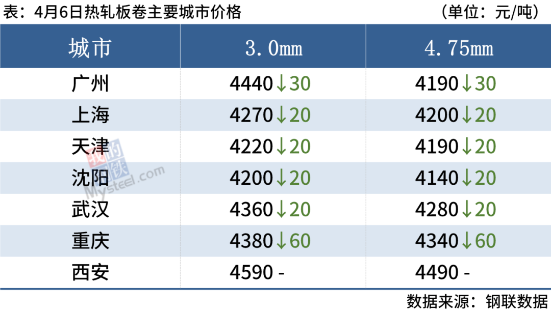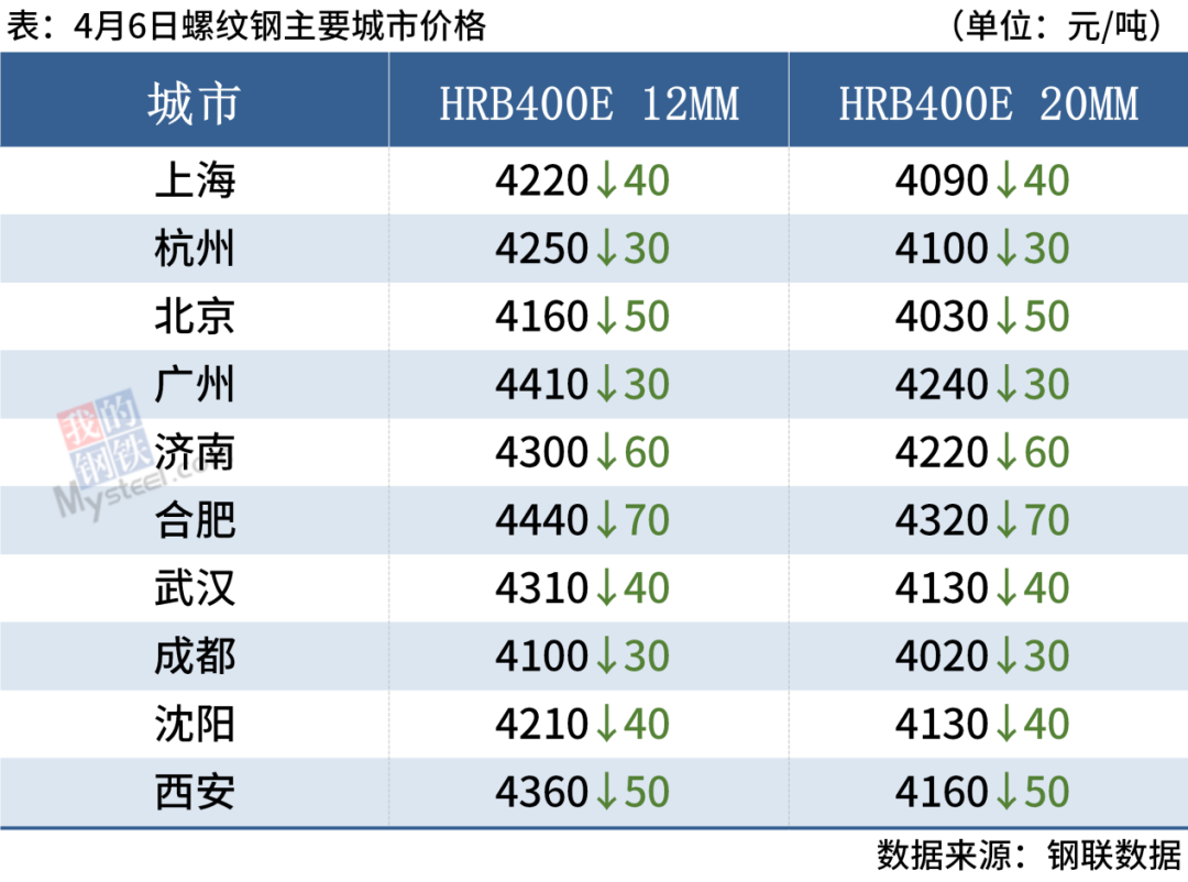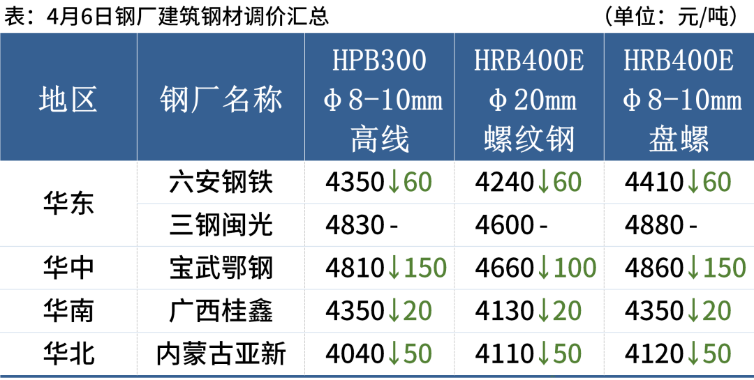 4月6日,国内4家钢厂下调建筑钢材出厂价20-150元/吨。