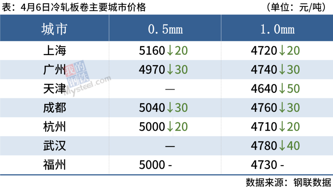 冷轧板卷:4月6日,全国24个主要城市1.0mm冷卷均价4790元/吨,较上个交易日下跌30元/吨。早盘热卷期货弱势下行,市场报价小幅趋弱,盘中随着期卷继续走弱,商家心态转差,降价抛售增多,部分商家为促成交价格继续下调10-20元/吨。成交方面,据商家反馈,由于价格持续走低,市场悲观情绪凸显,成交氛围偏弱,出货不畅。综合来看,近期受天气等因素影响,需求释放有限,预计7日国内冷轧板卷价格或将震荡偏弱运行。